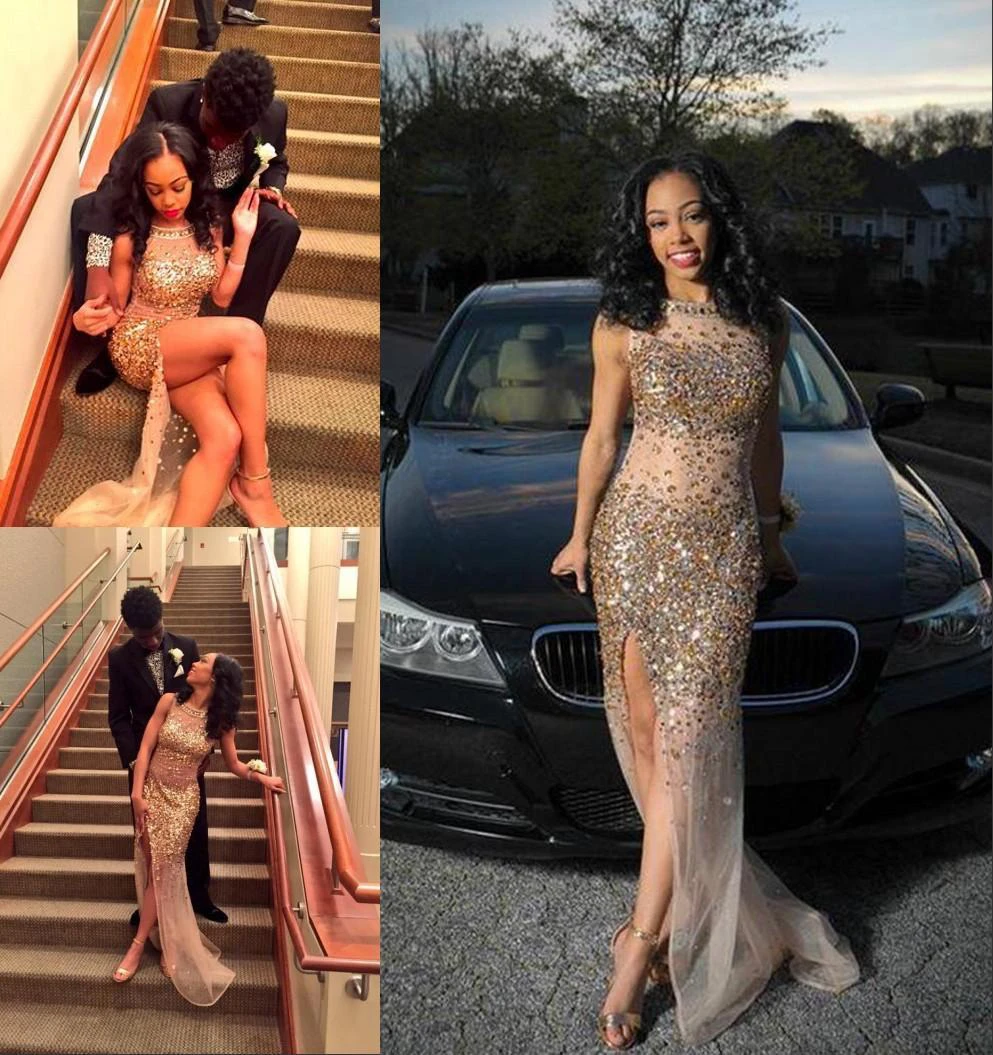 Luxurious Crystals Front Split Prom Dress Mermaid Jewel Sleeveless Sweep Train