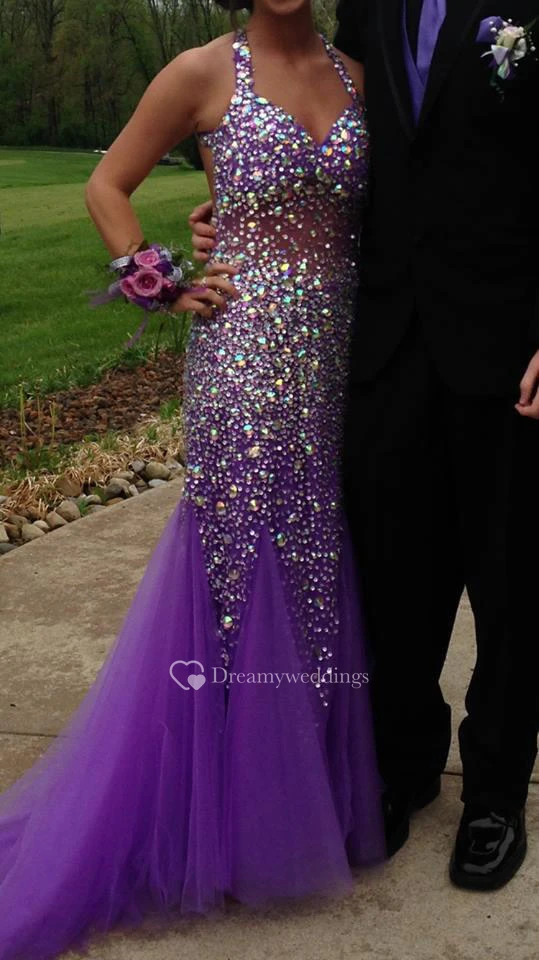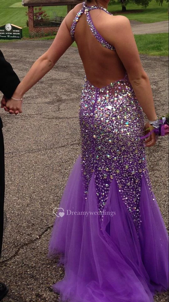 Luxurious Crystals Sequins Mermaid Evening Dress Halter Sweep Train