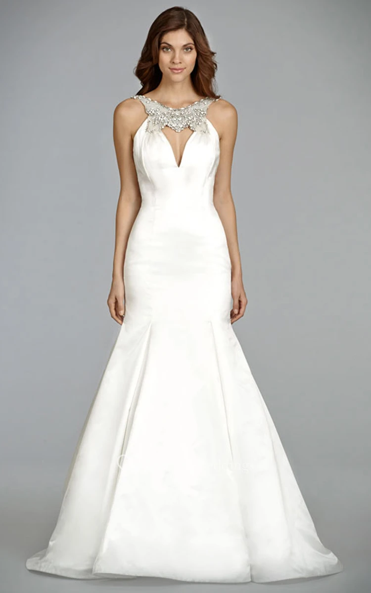This gorgeous satin gown seems to appear from a fairy-tale. Sweetheart neckline with deep provocative plunge features a pearl beaded necklace style exquisite collar forming a key-hole shape of the upper part of the bodice and becoming further a gorgeous appliqué detail adorning the edge of the open back. Slim fitting dropped waist bodice ideally accents your feminine body shapes. Below the hipline gorgeous mermaid silhouette skirt is gently pleated to dramatically flare downstream to the feet and form a wonderful chapel train behind.