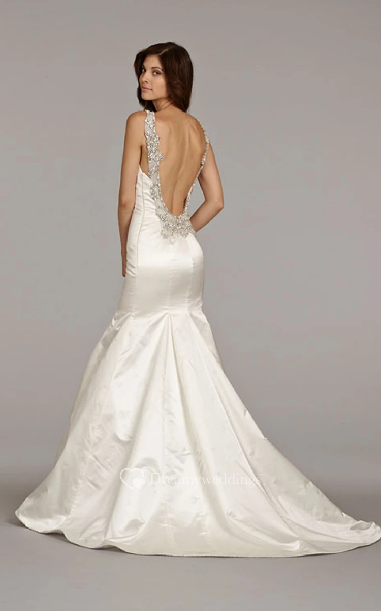 Magnificent V-Neck Satin Mermaid Gown With Beaded Applique Embellishment