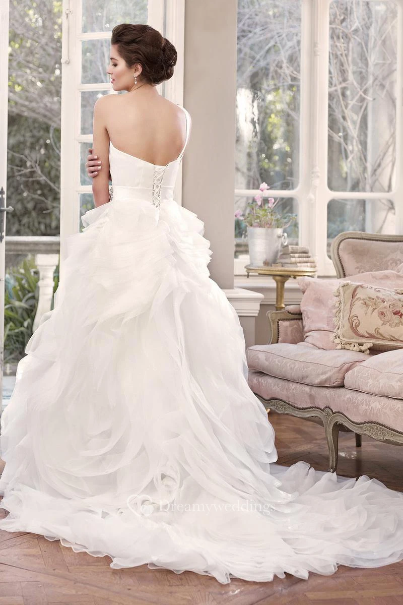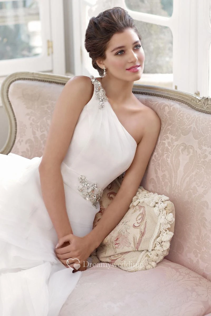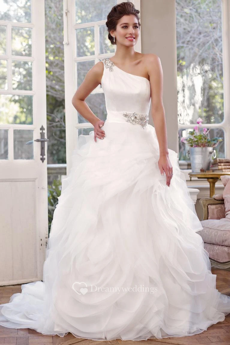 Maxi One-Shoulder Jeweled Organza Wedding Dress With Chapel Train And Corset Back