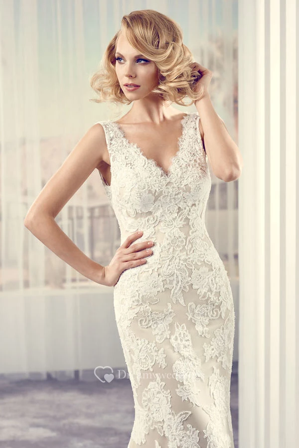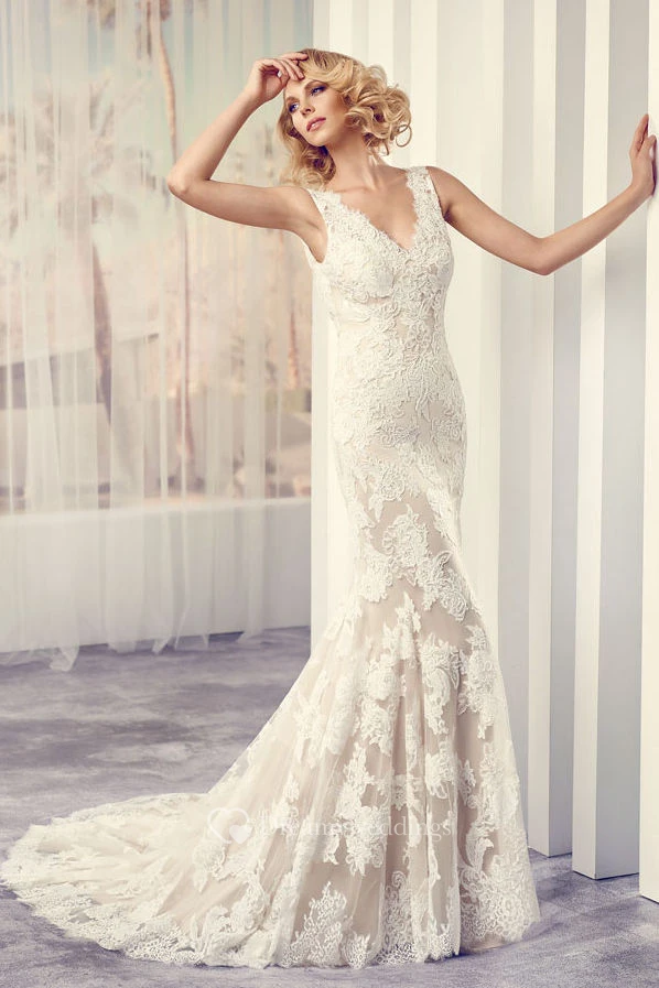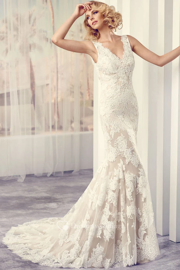 Maxi V-Neck Appliqued Lace Wedding Dress With Court Train And V Back