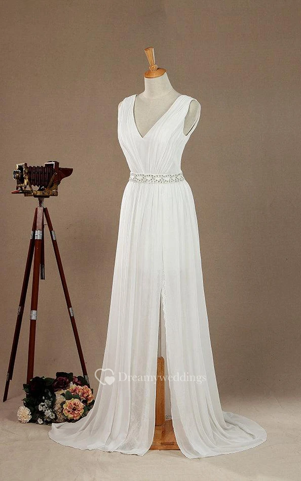 Maxi V-Neck Chiffon Lace Satin Weddig Dress With Low-V Back