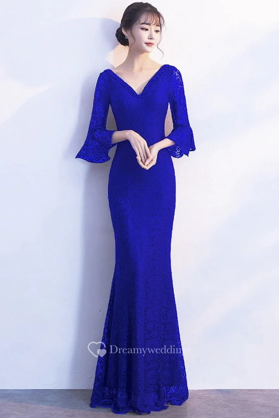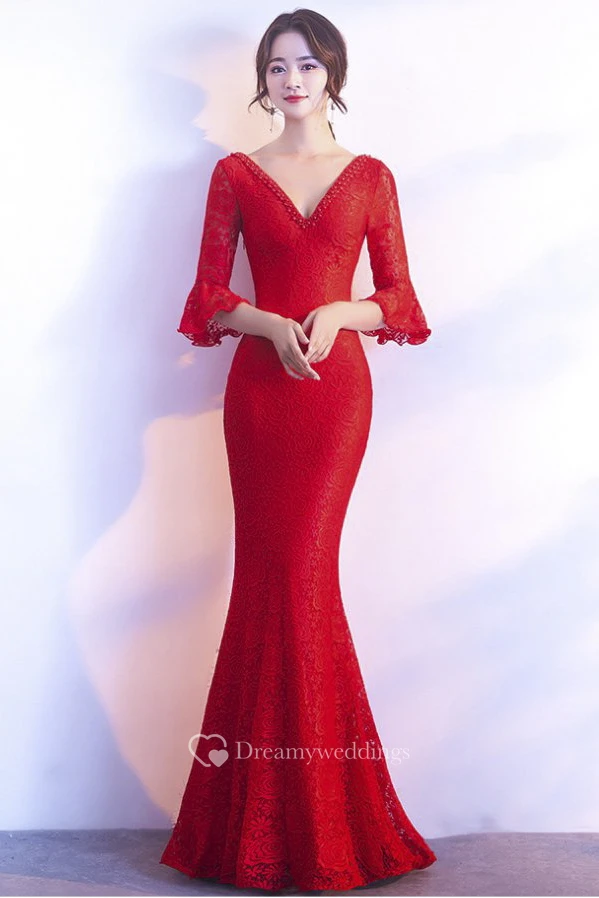 Mermaid 3/4 Poet Sleeve Sexy Dress With Deep V-neck And Straps Back