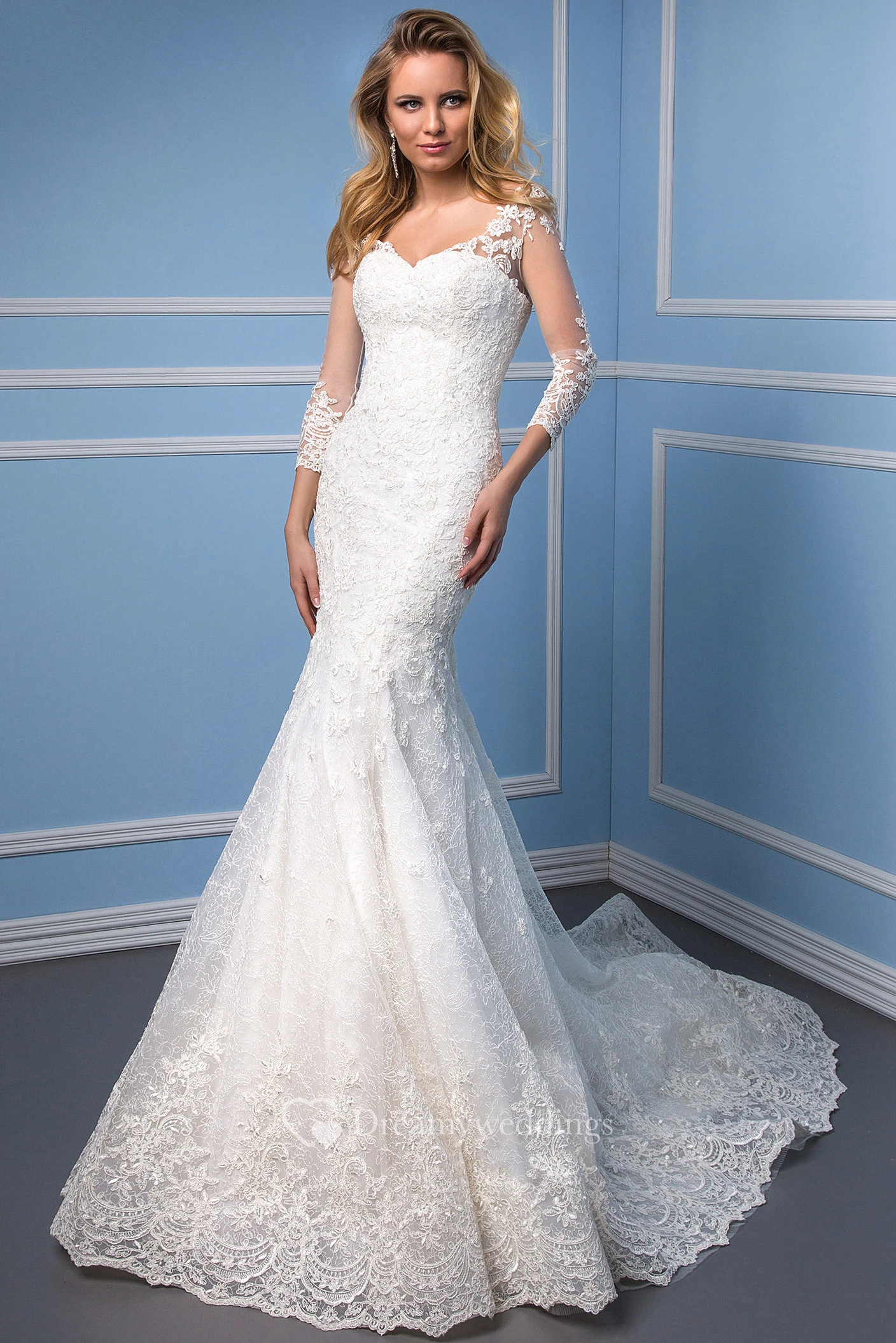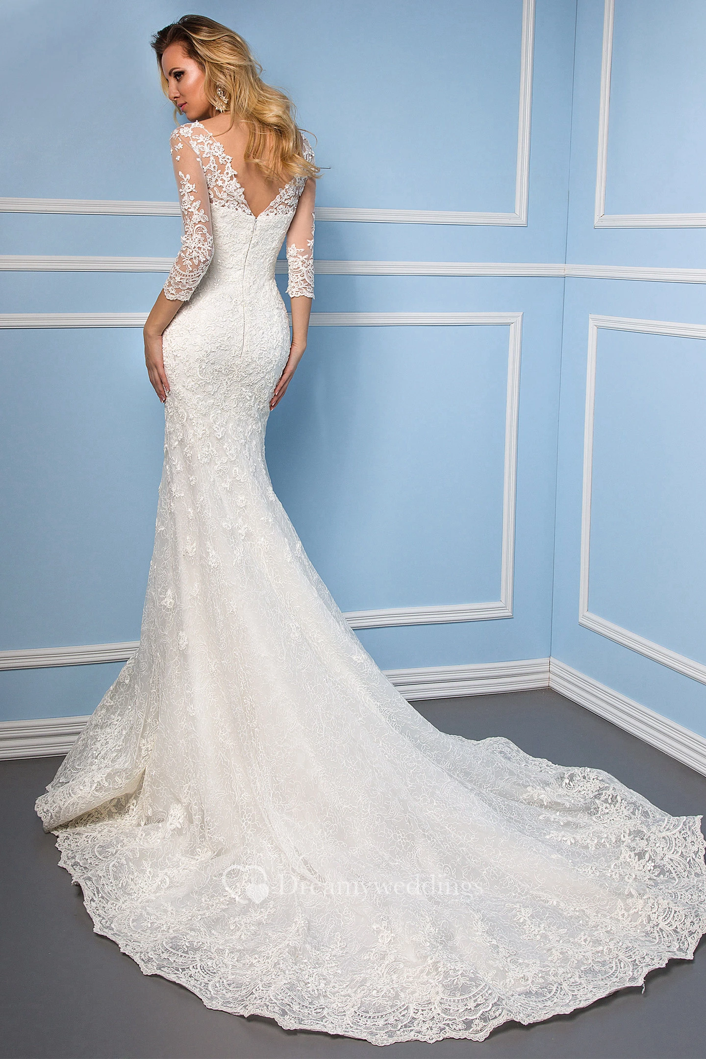 Mermaid 3-4 Sleeve V-Neck Appliqued Lace Wedding Dress With Chapel Train