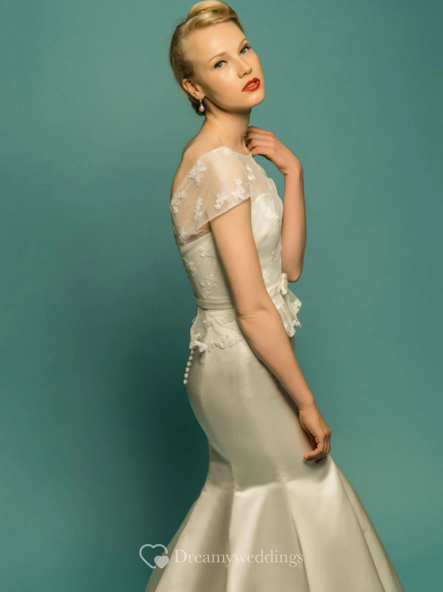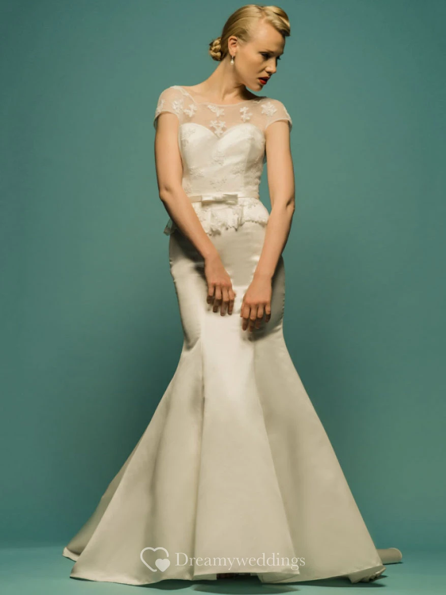 Mermaid Appliqued Short-Sleeve Scoop-Neck Maxi Satin Wedding Dress With Peplum