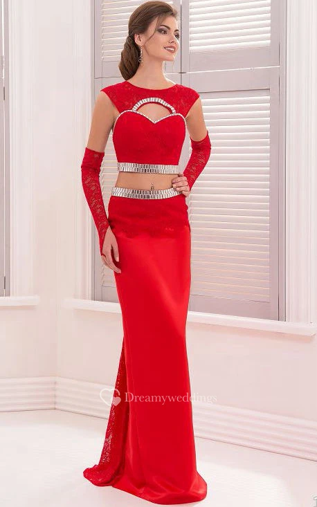 Mermaid Court Train High-Neck Short Sleeve Lace Crystal Detailing Pleats Keyhole Dress