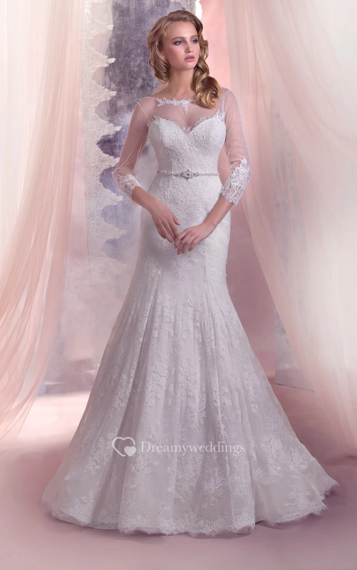 Mermaid Floor-Length Bateau-Neck Illusion-Sleeve Lace-Up Lace Dress With Beading
