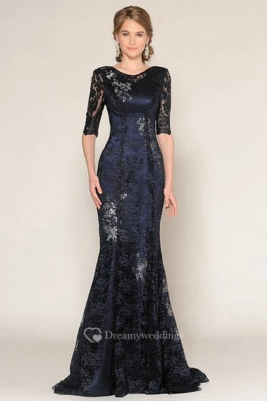 Mermaid Floor-Length Half-Sleeve Scoop-Neck Appliqued Lace Prom Dress