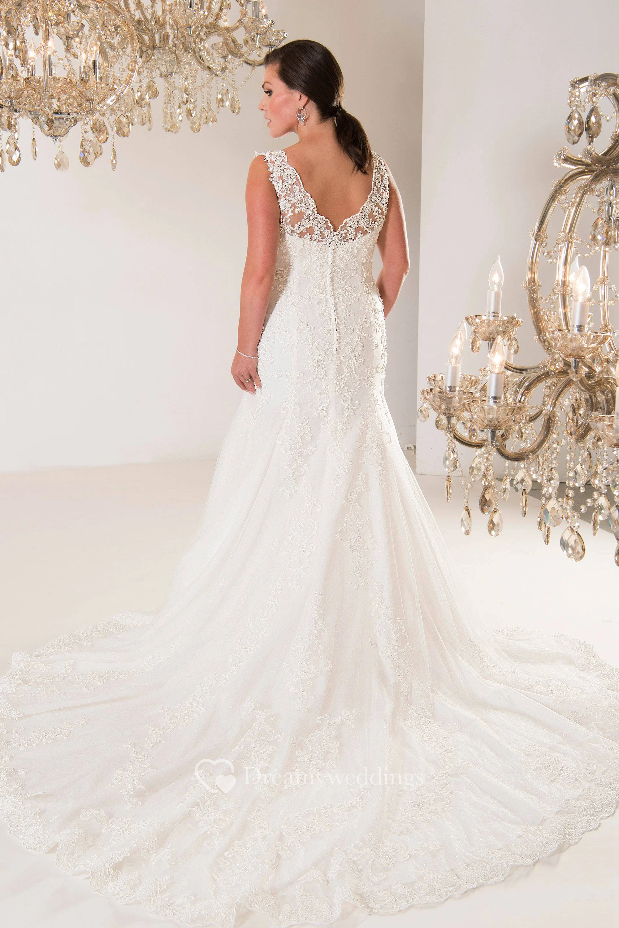 Mermaid Floor-Length V-Neck Sleeveless Lace Court Train Low-V Back Appliques Dress