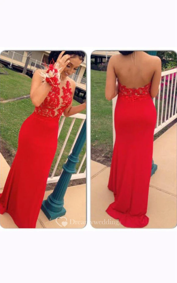 Mermaid Halter Sleeveless Appliques Backless Zipper Chiffon Lace Dress