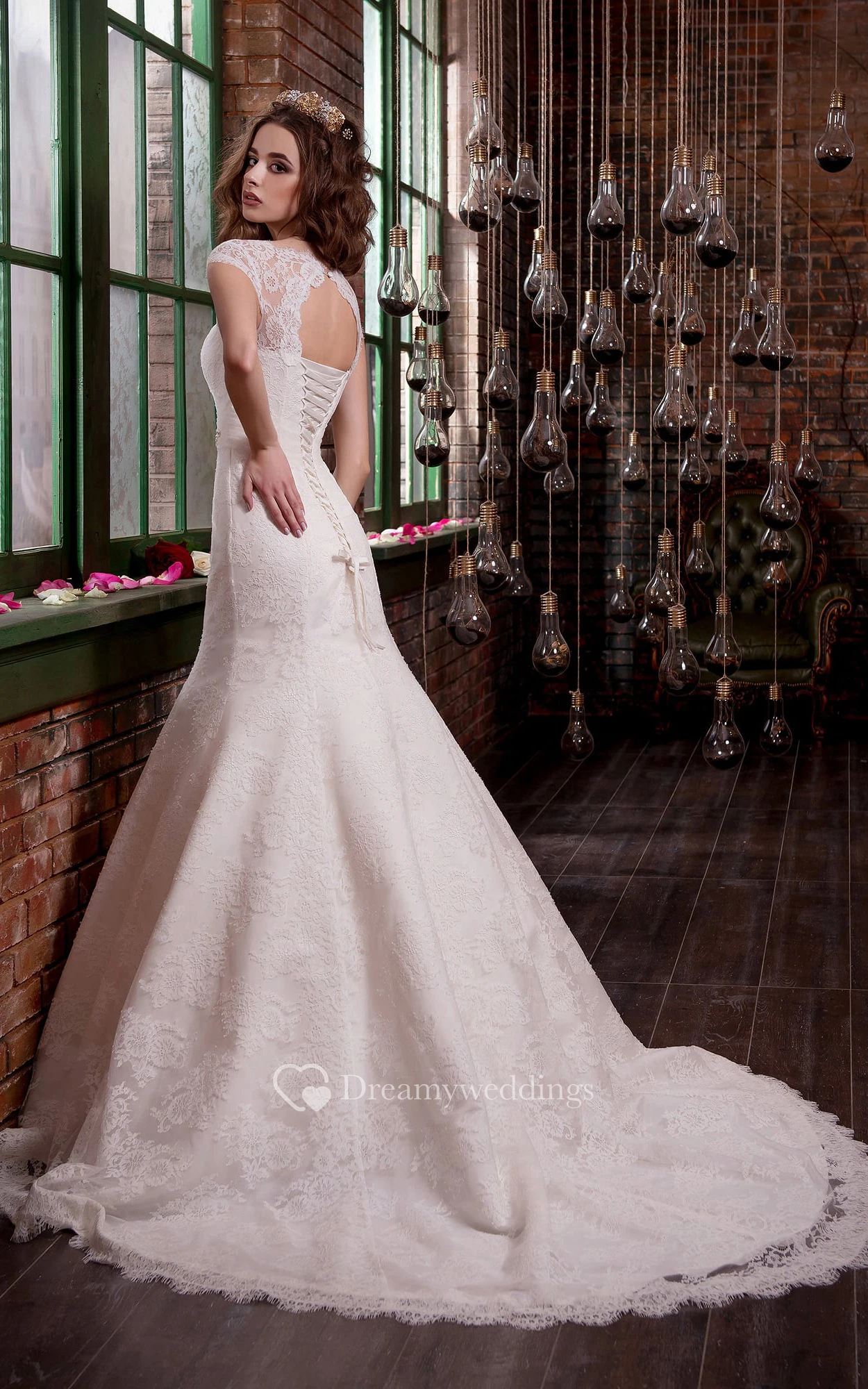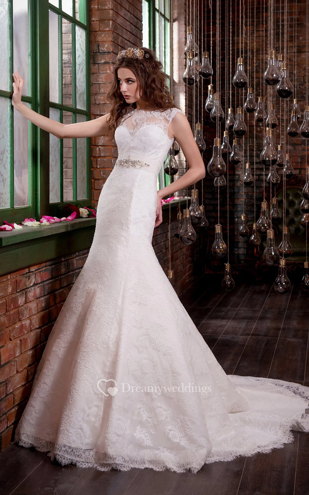 Mermaid Long Bateau Sleeveless Corset-Back Lace Dress With Appliques And Waist Jewellery