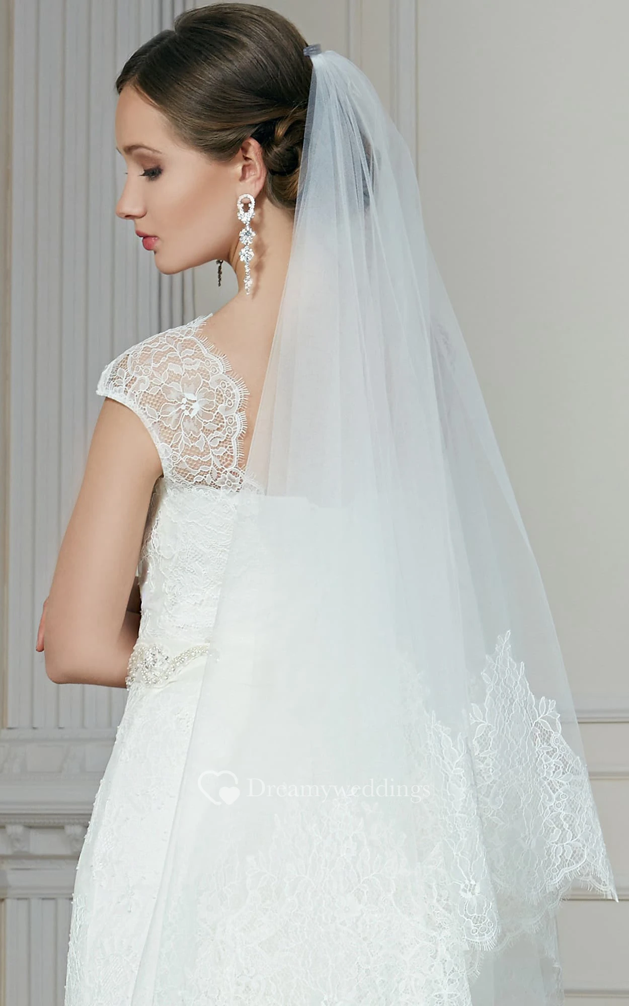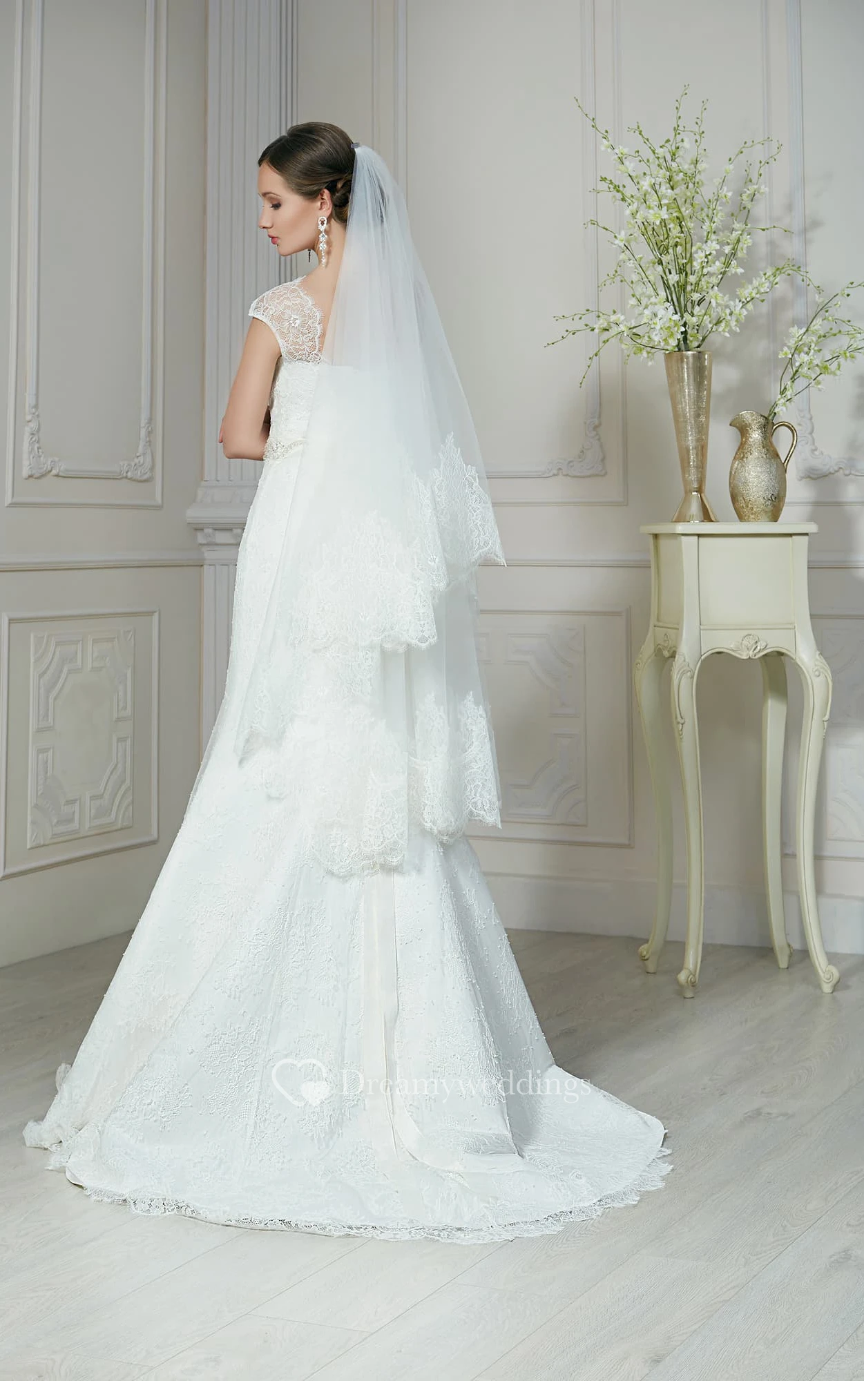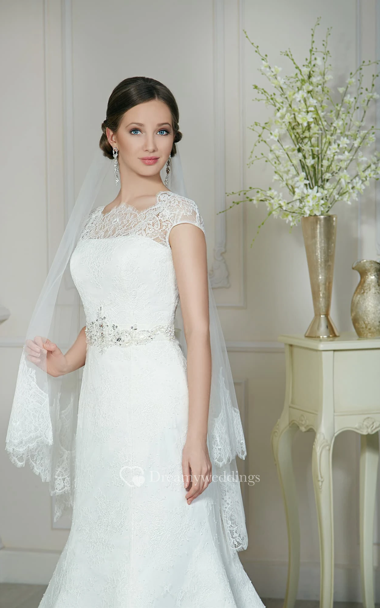 Mermaid Long Jewel-Neck Cap-Sleeve Corset-Back Lace Dress With Beading