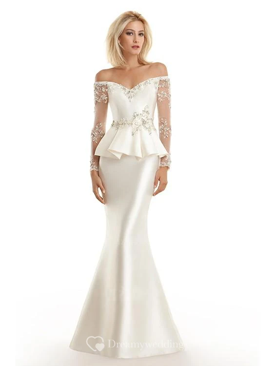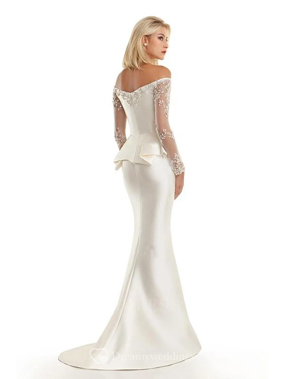 Mermaid Long Sleeves Off-the-Shoulder Elastic Woven Satin Sweep Train Applique Dresses