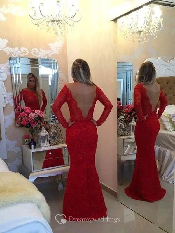Mermaid Long Sleeves Scoop Lace Sash Sweep Train Dresses