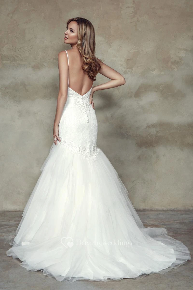 Mermaid Sleeveless Floor-Length Appliqued Spaghetti Lace&Tulle&Satin Wedding Dress With Ruffles And Backless Style