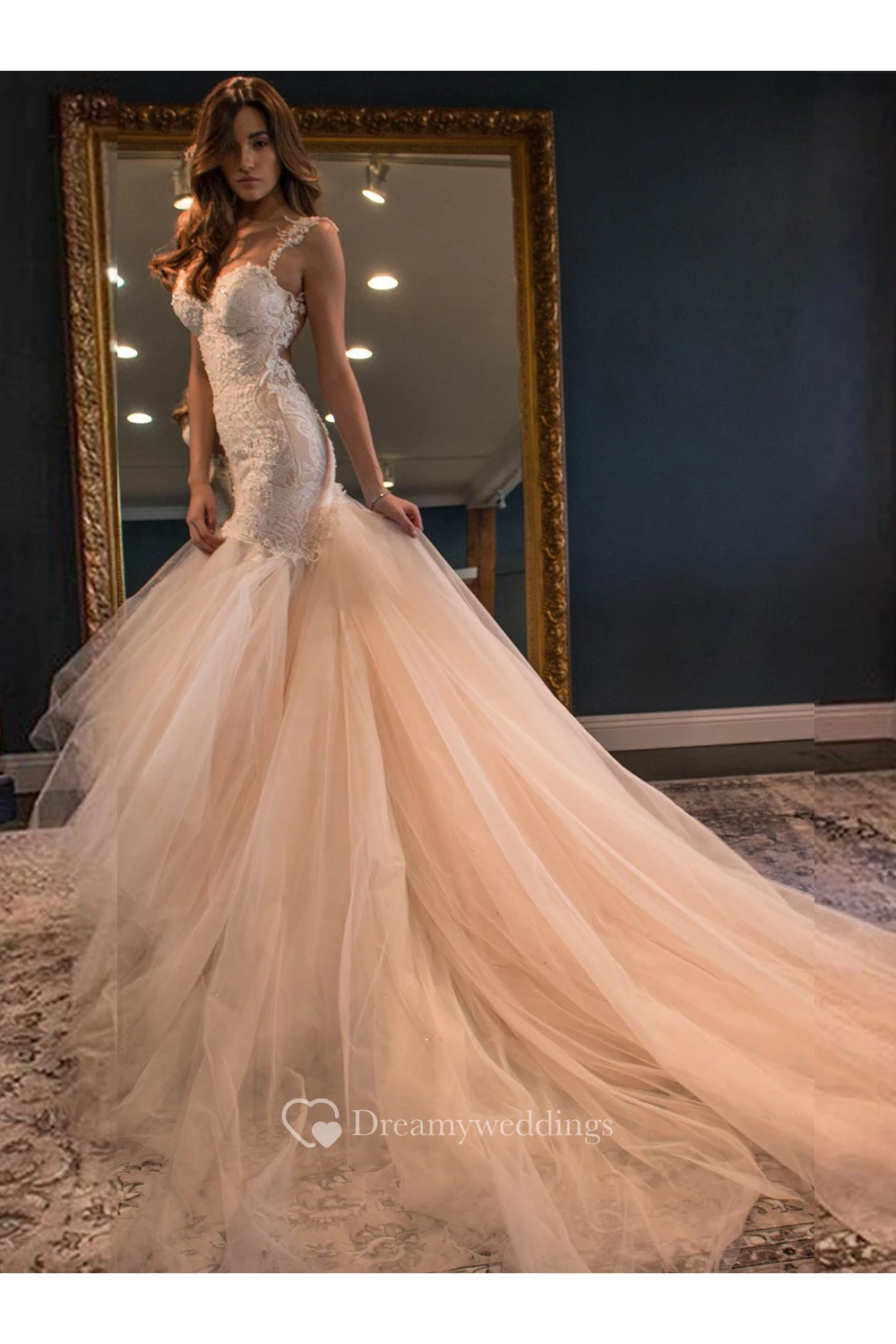 Mermaid Straps Backless Chapel Train Pink Wedding Dress with Lace Wedding Dresses