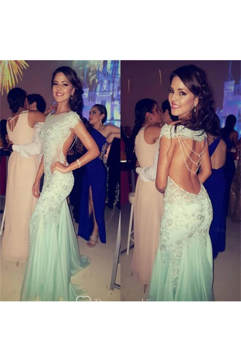 Mermaid Trumpet Lace Tulle High Neck Short Sleeve Open Back Backless Dress
