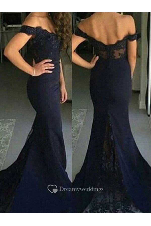 Mermaid Trumpet Satin Lace Off-the-shoulder Short Sleeve Zipper Low-V Back Dress