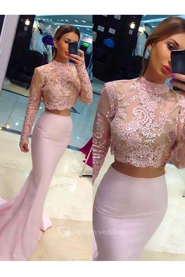 Mermaid Trumpet Two Piece Satin Lace High Neck Long Sleeve Zipper Dress