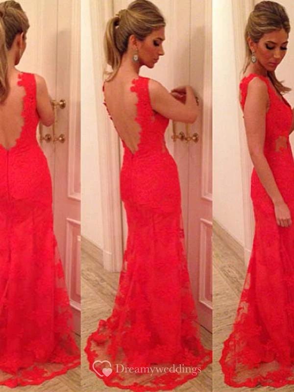 Mermaid V-neck Applique Sleeveless Lace Backless Floor-length Dress