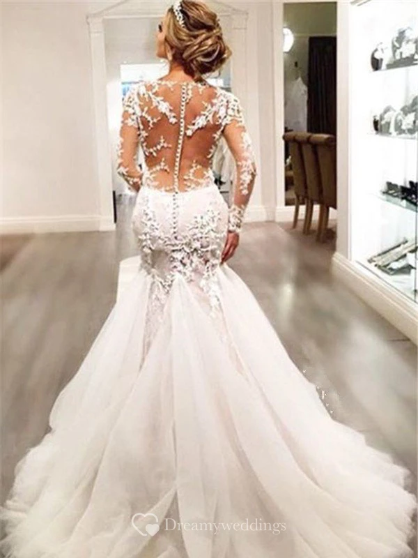 Mermaid V-neck Long Sleeves Lace Court Train Tulle Wedding Dresses
