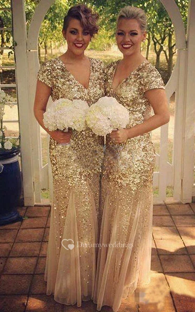 Mermaid V-neck T-Shirt Draping Pleats Brush Train Zipper Sequins Dress