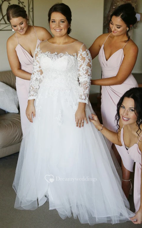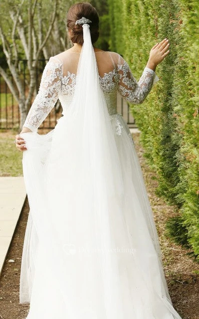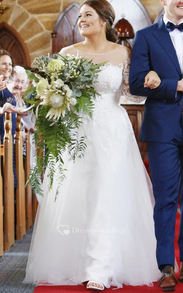 Modern A Line Lace Floor-length Long Sleeve Illusion Wedding Dress with Appliques