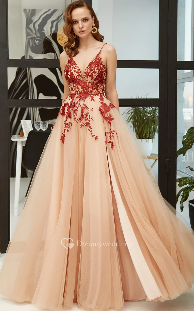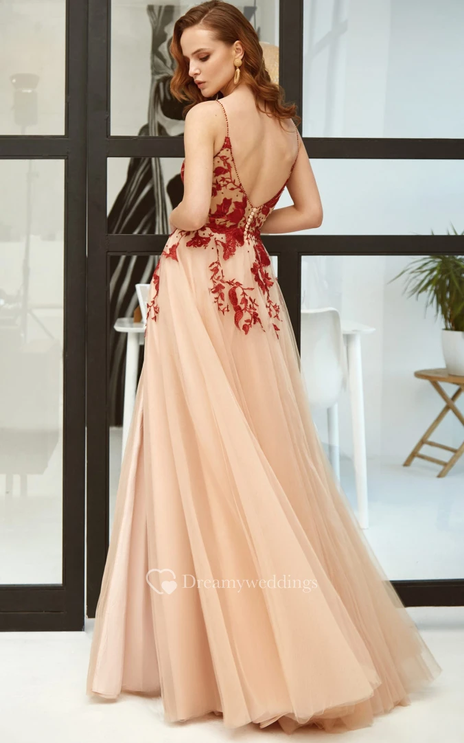 Modern A Line Lace V-neck Floor-length Open Back Evening Dress with Split Front