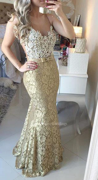 Modern Lace Appliques Mermaid Prom Dress Straps Sweep Train Bowknot