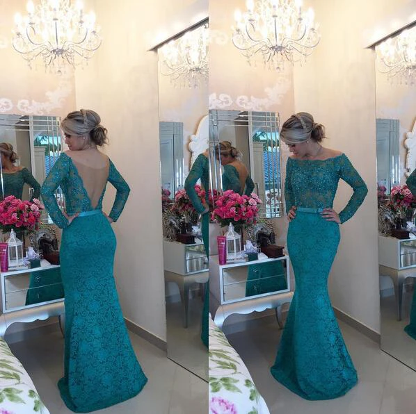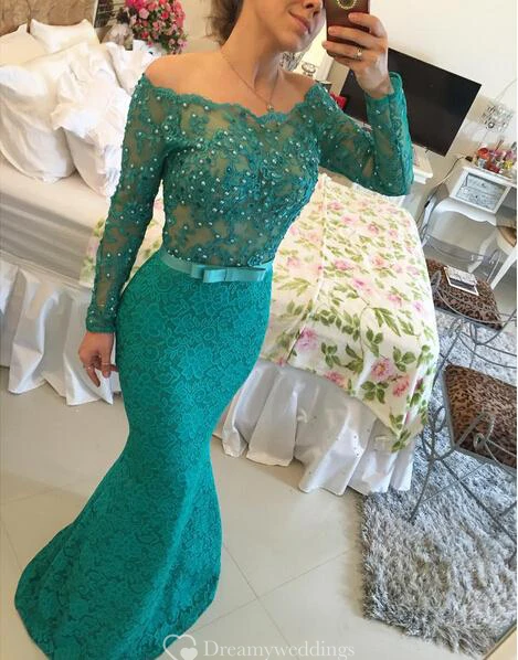 Modern Long Sleeve Lace Mermaid Prom Dress Pearls Off-the-shoulder