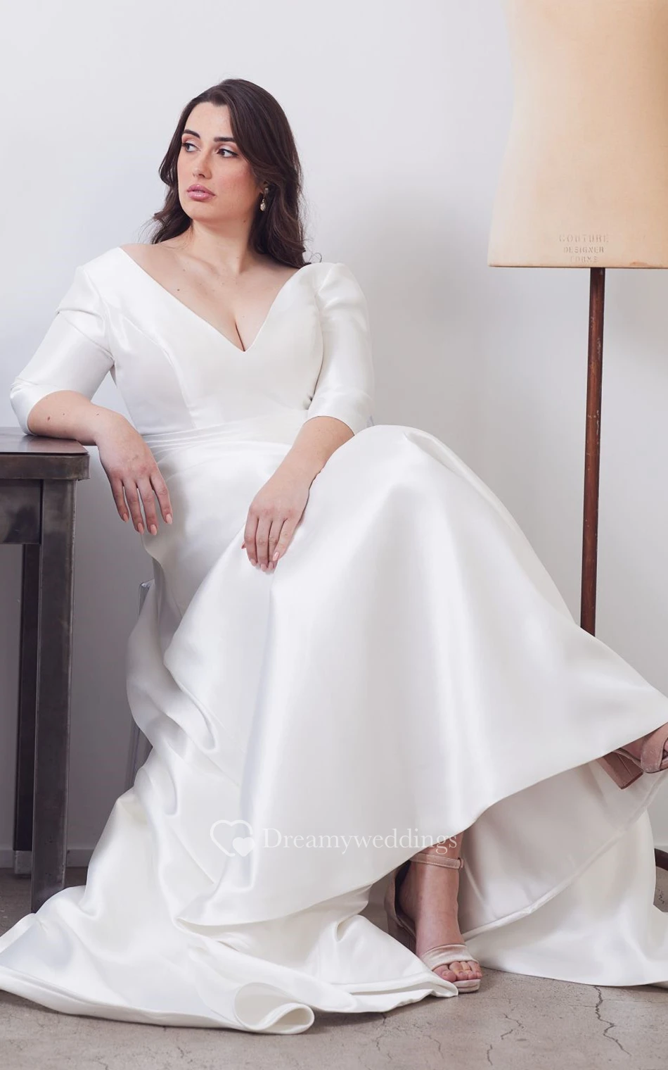 Modern Plus Size V-neck A Line Satin Wedding Dress with Pockets