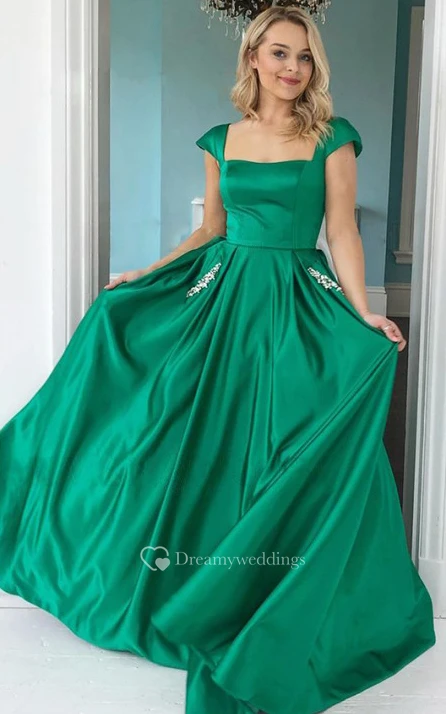 Modern Satin A Line Square Short Sleeve Prom Guest Evening Formal Dress