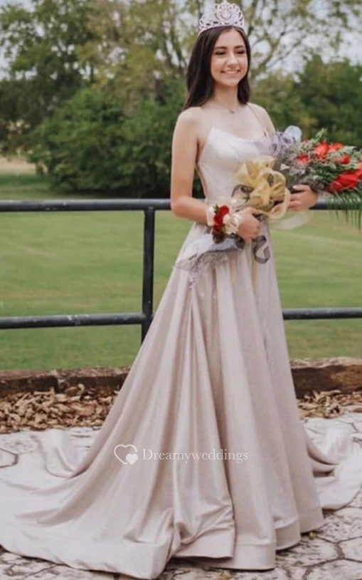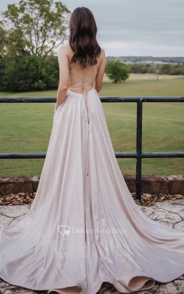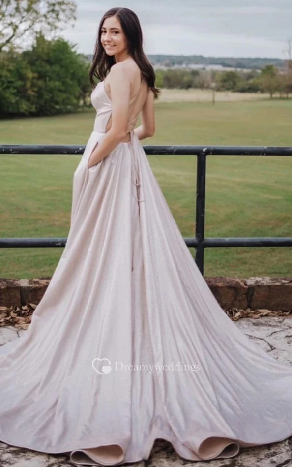 Modern Sleeveless Court Train A Line Satin Tied Back Formal Dress with Pockets