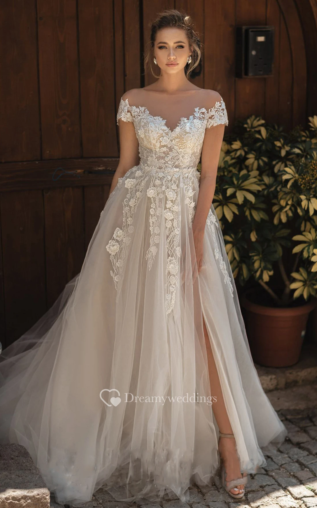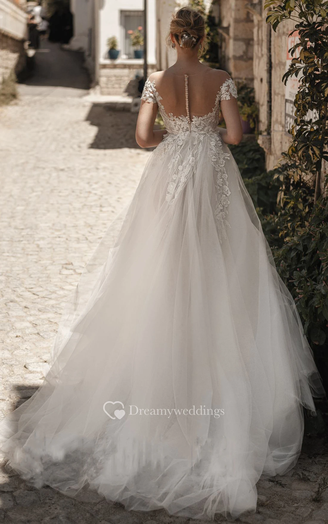 Modern Tulle Off-the-shoulder Short Sleeve Appliques Wedding Dress With Button