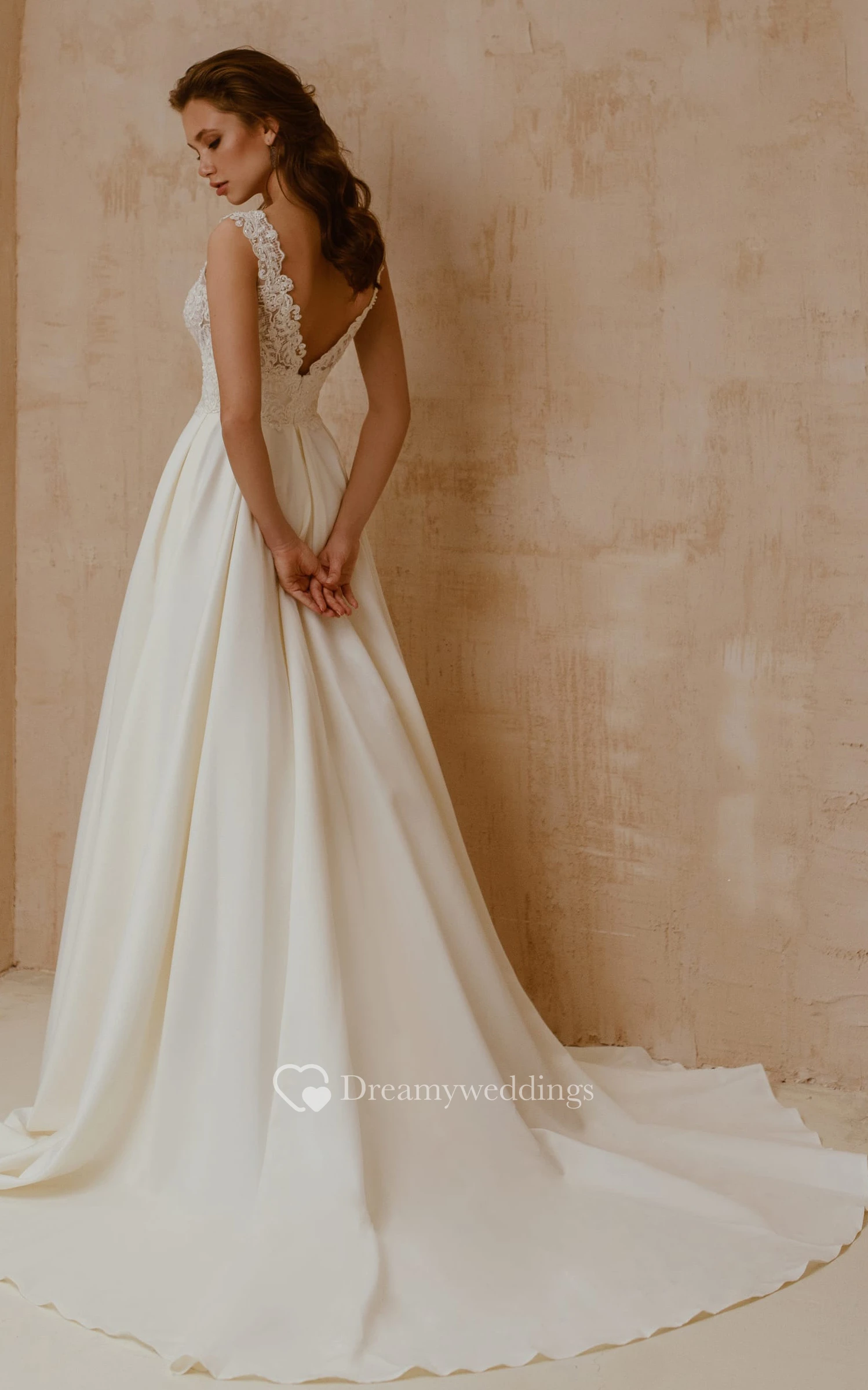 Modern V-neck Satin Lace A Line Short Sleeve Floor-length Sweep Train Wedding Dress with Pleats