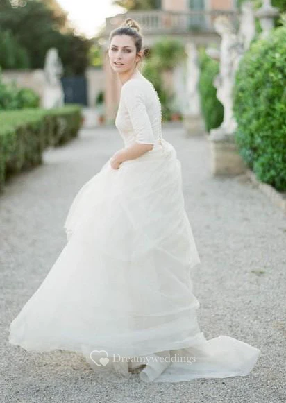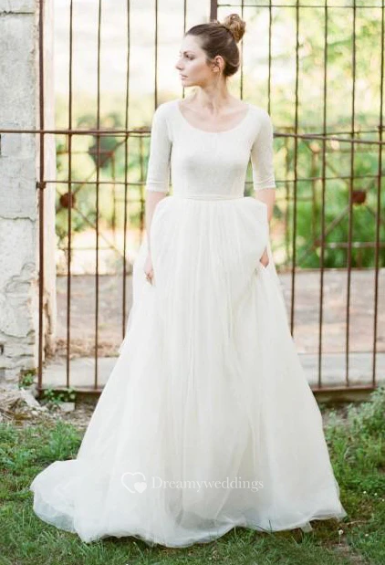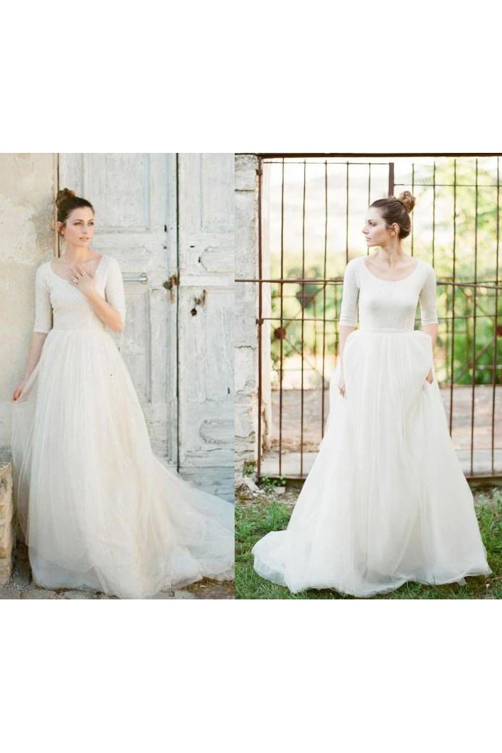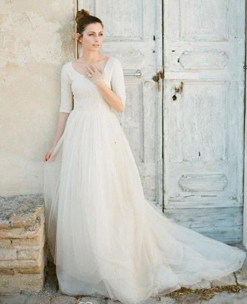 Modest A Line Scoop Neck Half Sleeved Full Back Tulle Skirt Wedding Dress with Sleeves