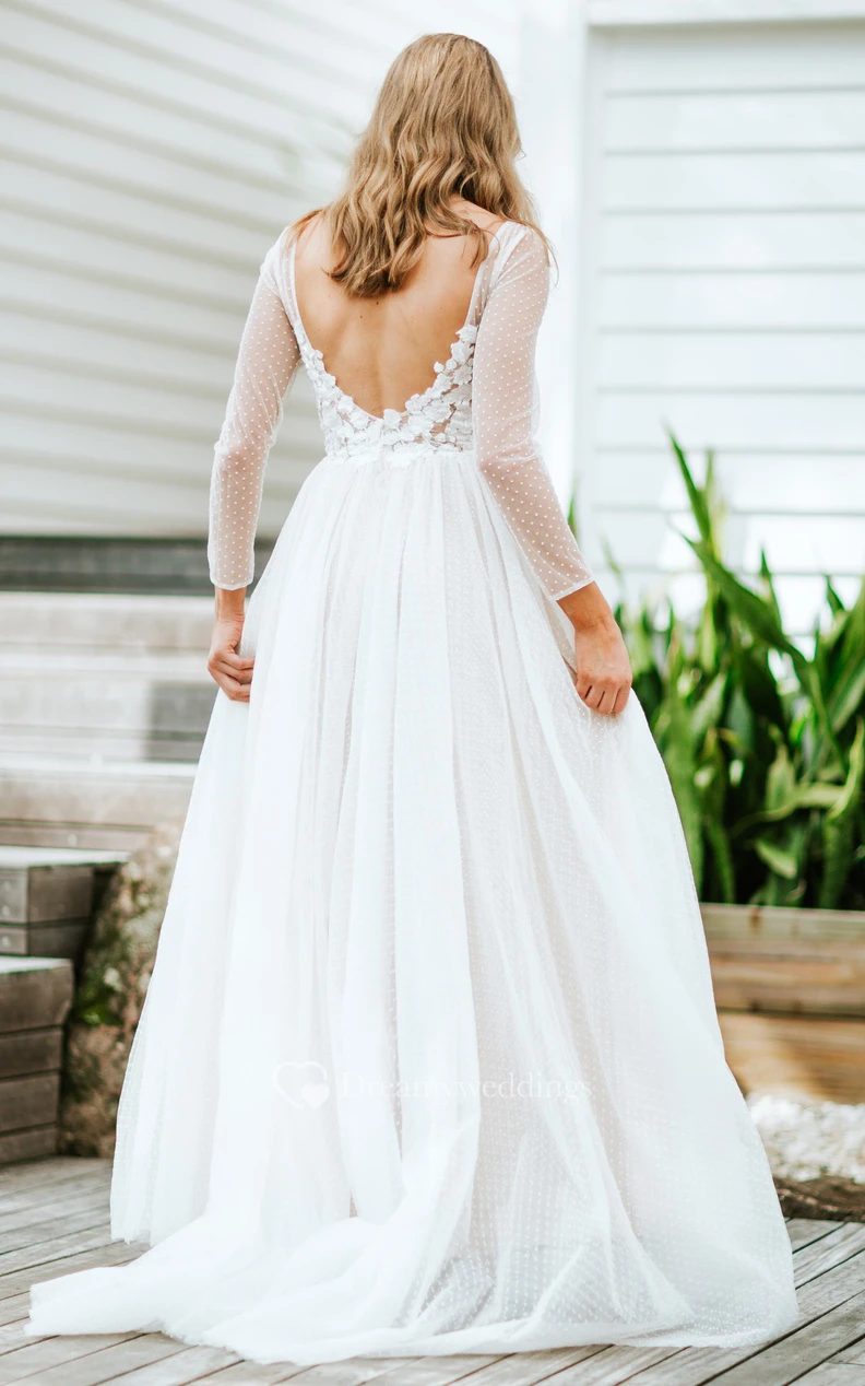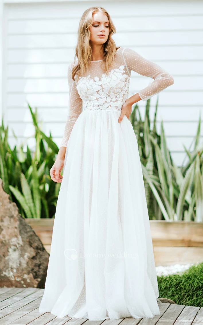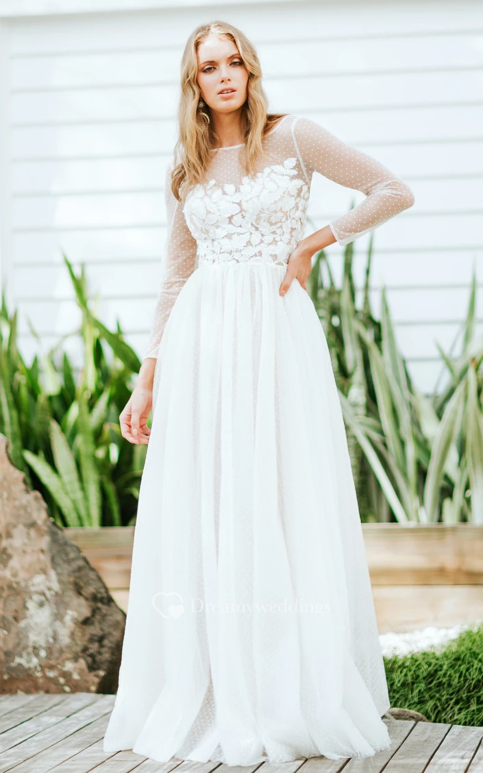 Modest Bateau A Line Lace Sweep Train Wedding Dress with Appliques