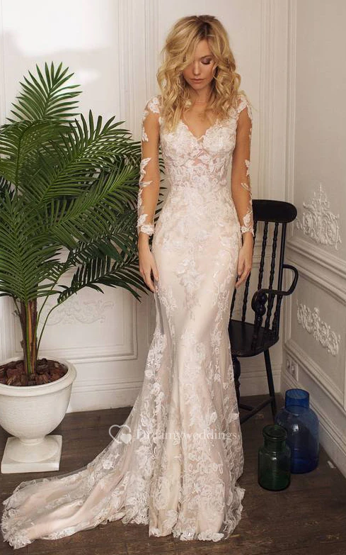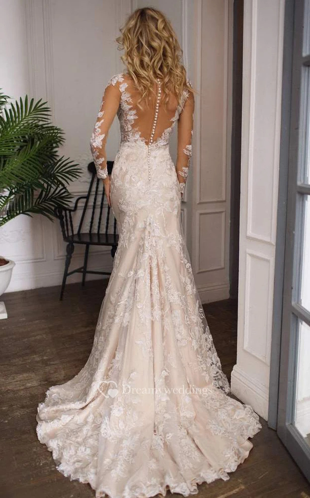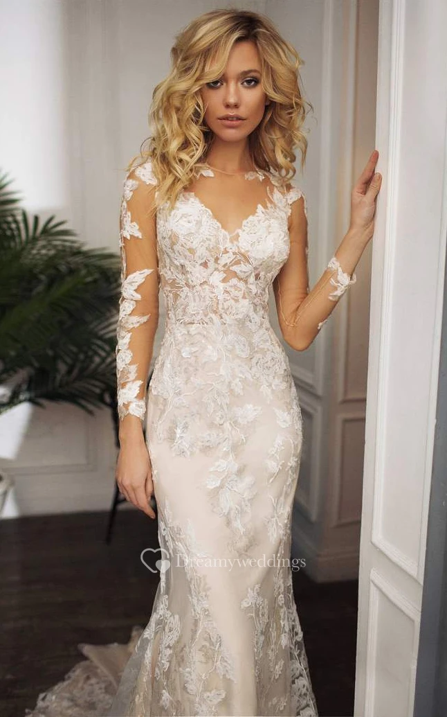 Modest Jewel Mermaid Floor-length Sweep Train Long Sleeve Wedding Dress With Appliques