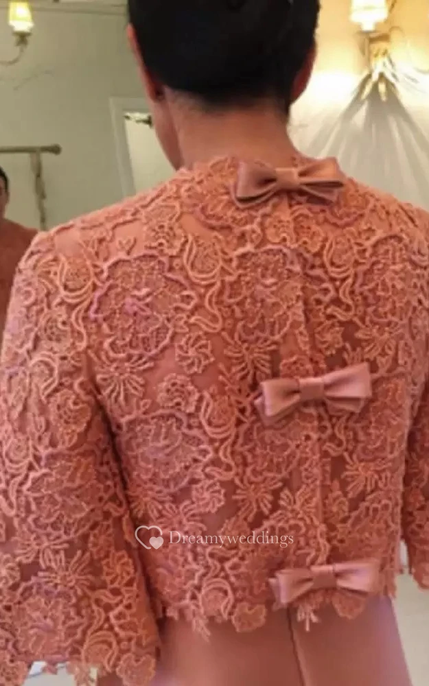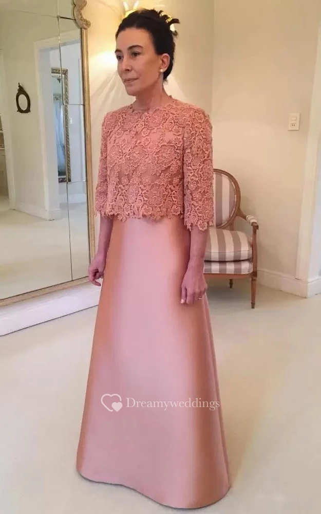 Modest Two Piece Jewel Floor-length 3/4 Length Sleeve Satin Mother of the Bride Dress with Bow