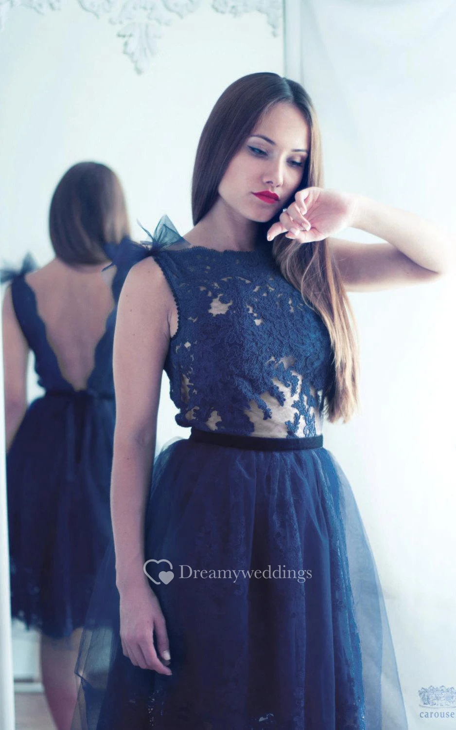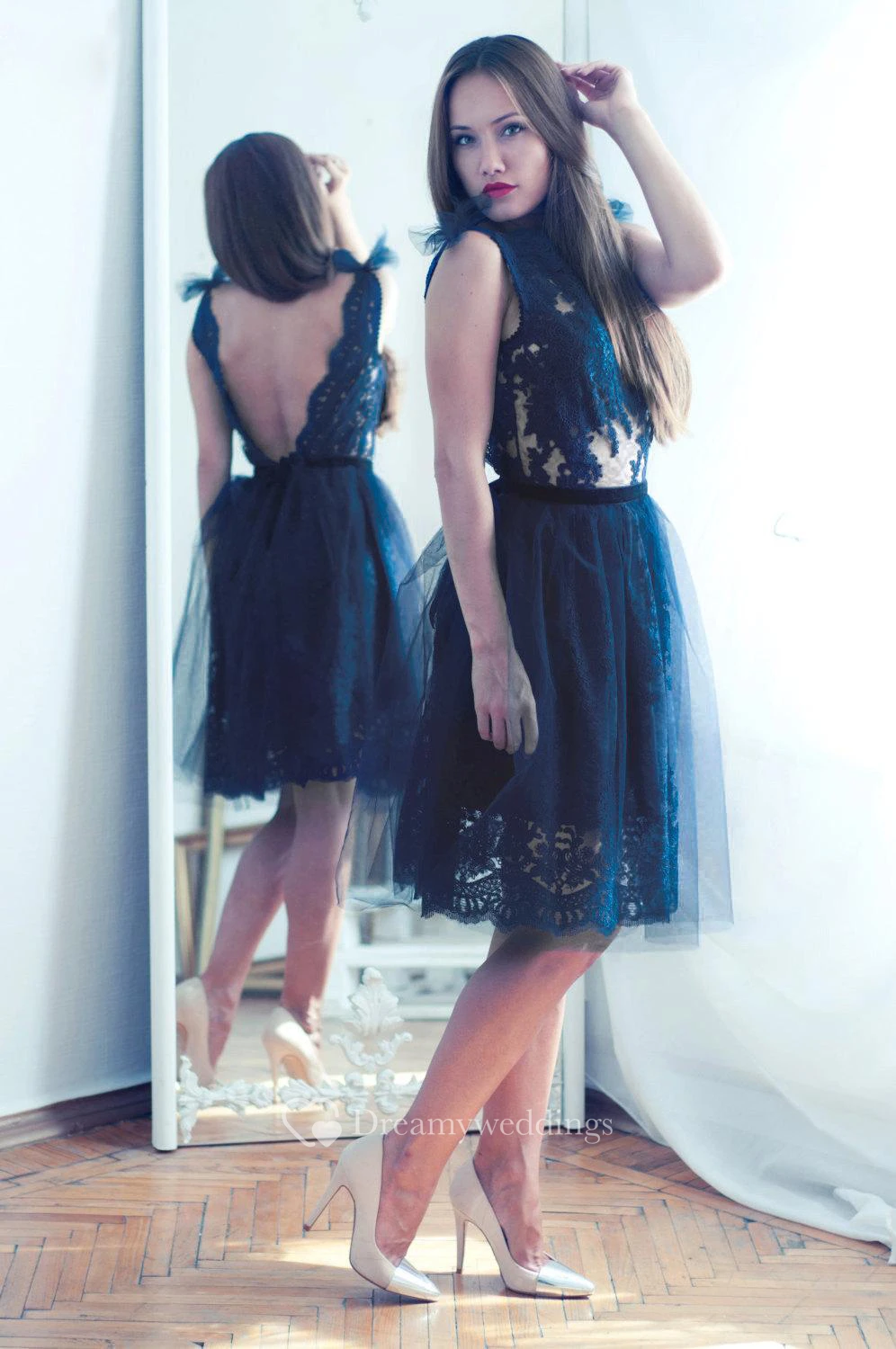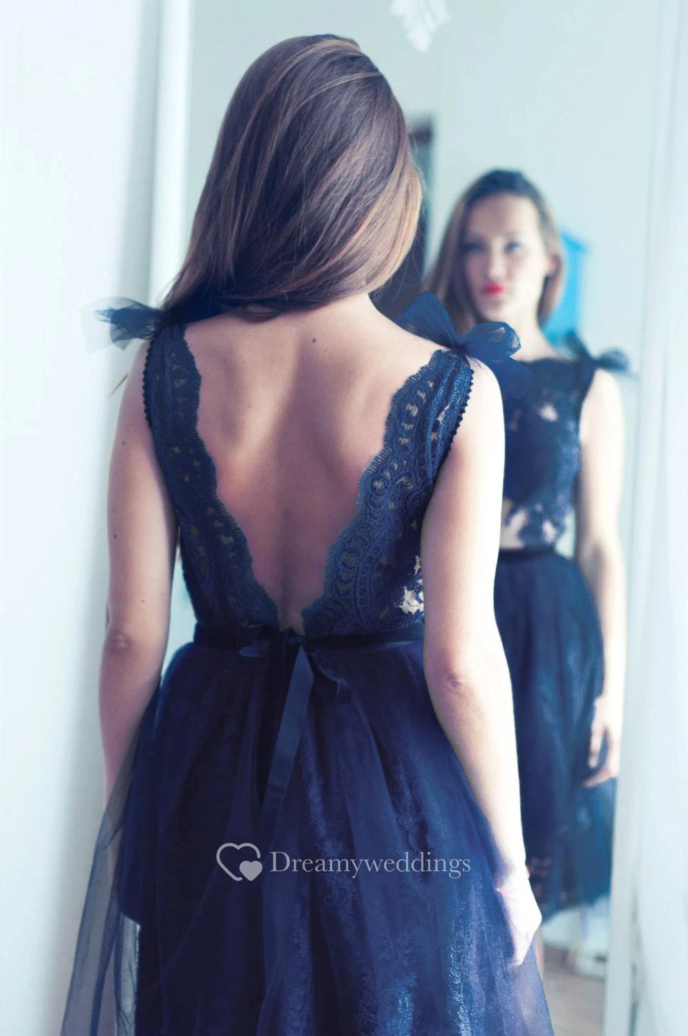 Navy Blue Lace Evening Open Back Dress