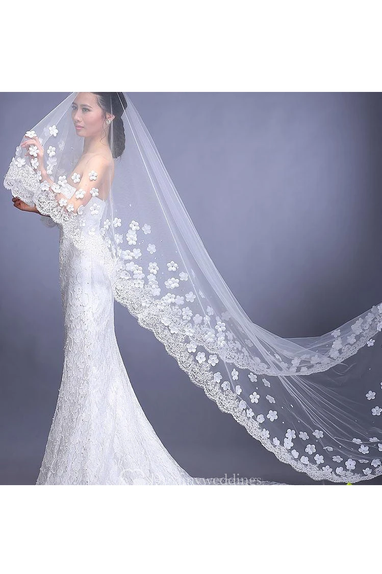 New Style Beautiful Long Wedding Veil with Flowers and Lace Edge