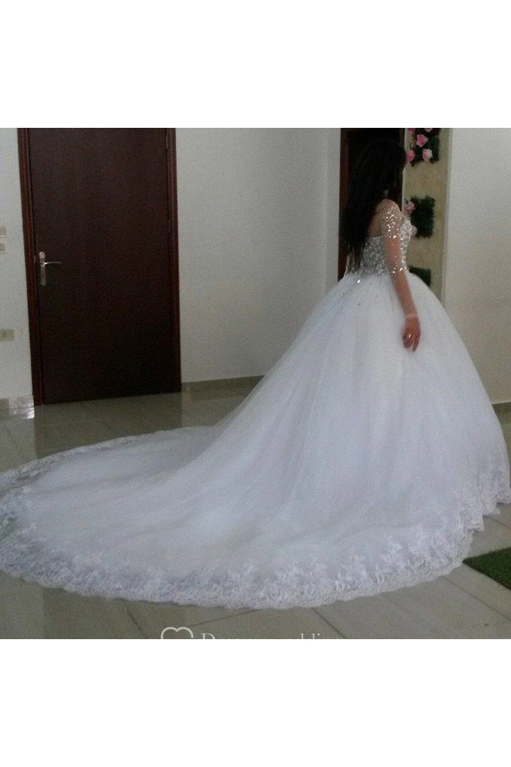 Newest Crystals Tulle Lace Illusion Wedding Dress Long Sleeve Ball Gown