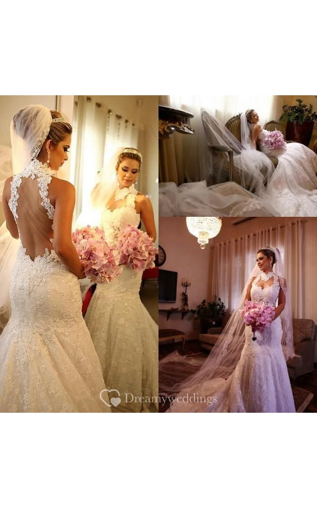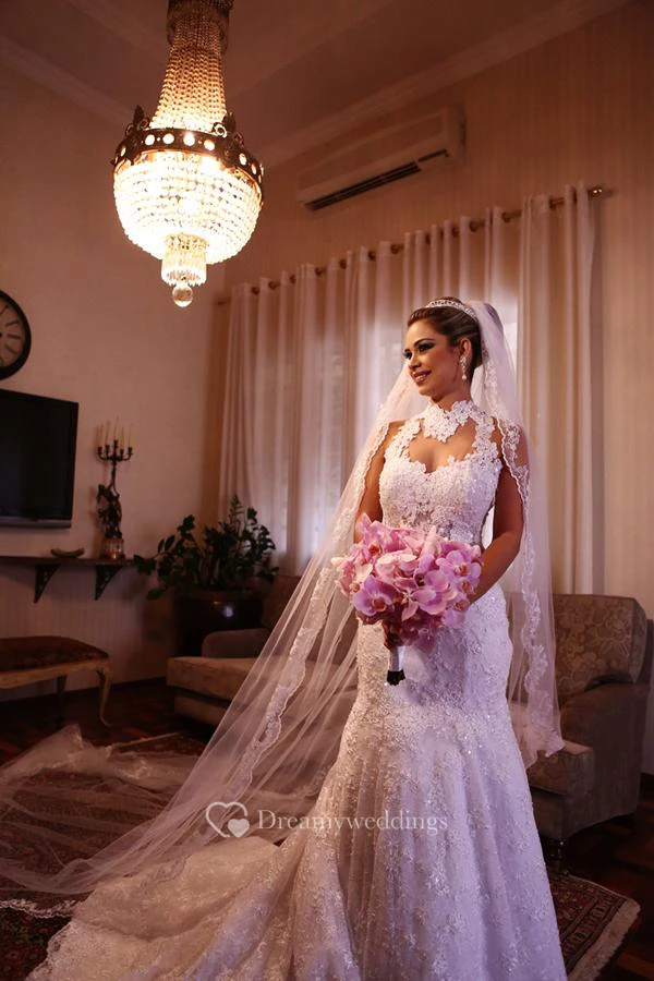 Newest High Neck Mermaid Wedding Dress Lace Appliques Court Train