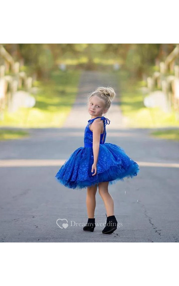 Newest Royal Blue Lace Appliques Flower Girl Dress Halter Puffy Mini