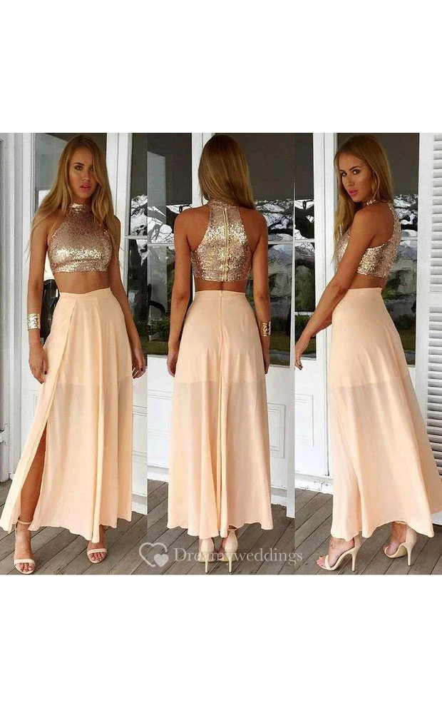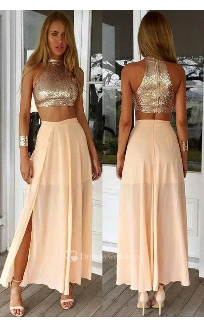 Newest Sequined Two Piece Prom Dress Front Split Floor-length