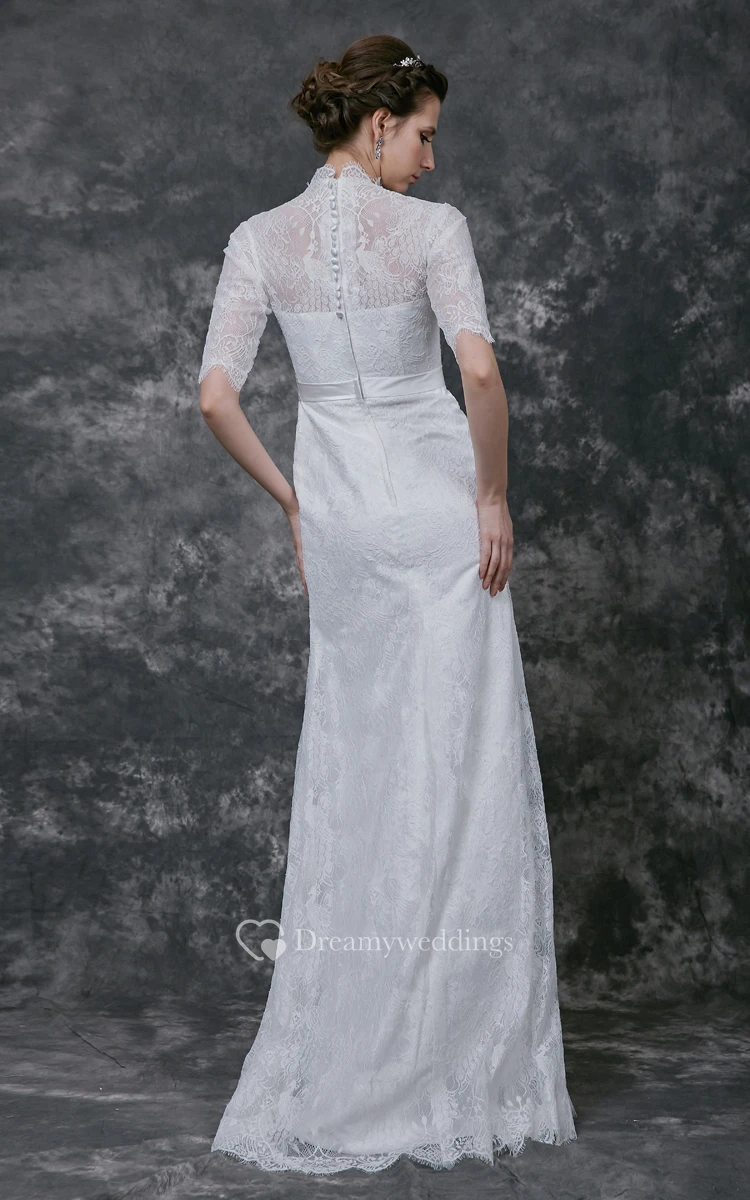 Noble Half Sleeve High Neck Form Fitted Lace Gown With Pleats