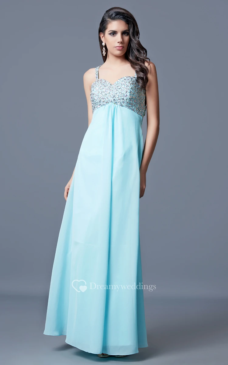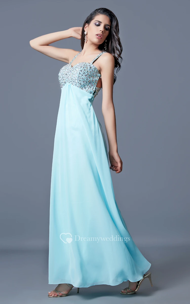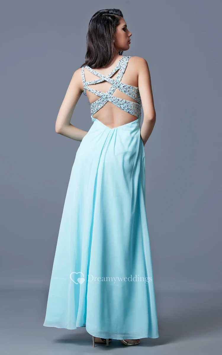Noble Sleeveless Long Ruched Chiffon Dress With Beaded Bust and Straps