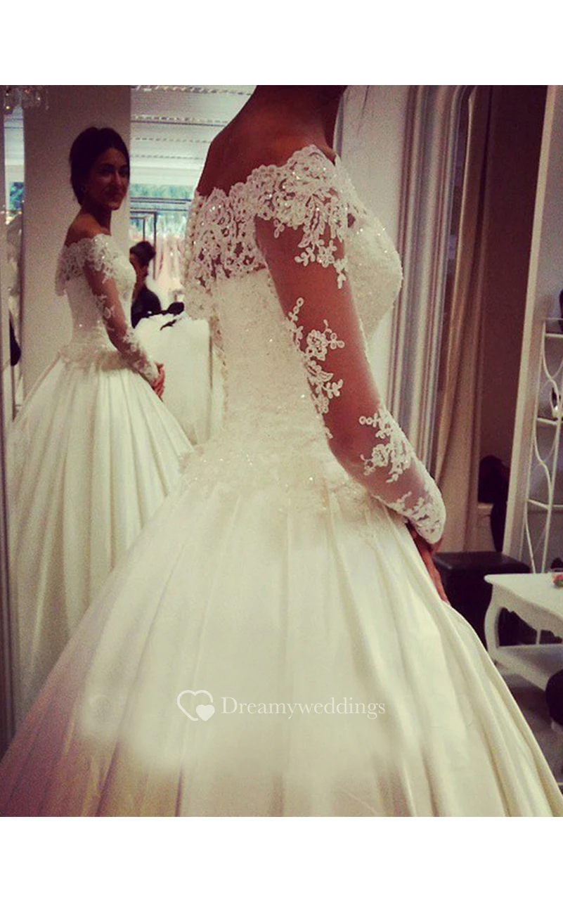 Off-shoulder Lace Illusion Long-sleeved Satin Ball Gown