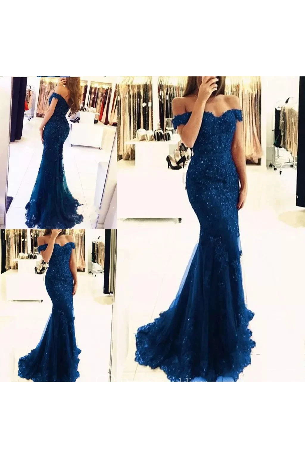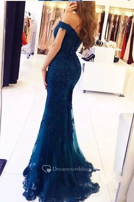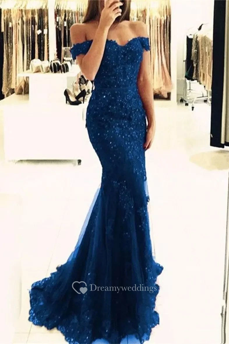 Off-the-shoulder Cap Short Sleeve Sweep/Brush Train Lace Tulle Trumpet Dress